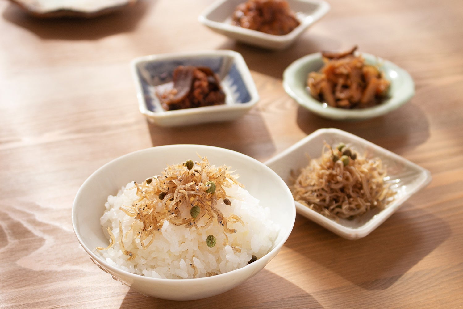 惣菜やお弁当の販売以外にも、ごはんをおいしく食べるための常備菜もご用意。巧みなアレンジを効かせた縮緬(ちりめん)じゃこ、和牛味噌しぐれ煮などの瓶詰め調味料、少しだけ贅沢で上質なごはんのお供に。ご自宅のフードストックや、ちょっとした手土産にもうれしいアイテムです。