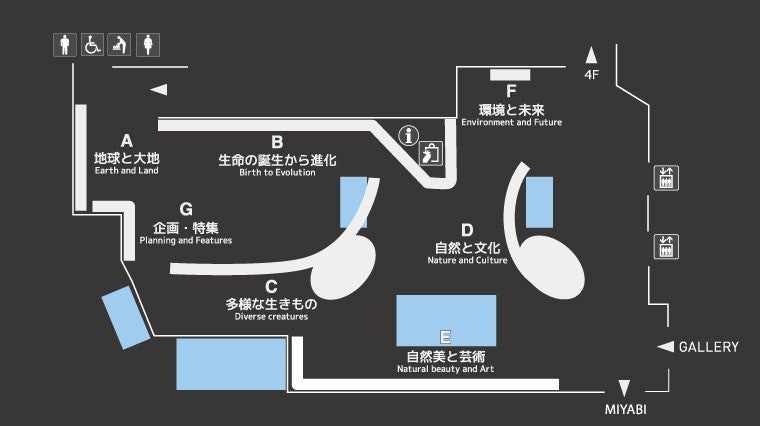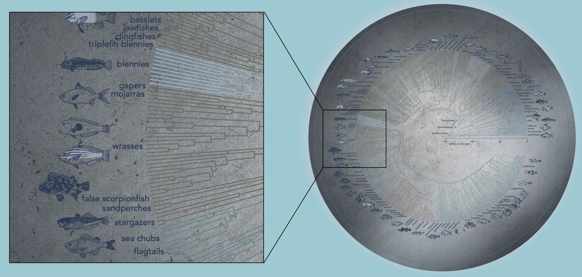 魚類の分岐年代や系統関係を樹枝状で表した「系統樹」を床一面に配置。形状が異なるけれど実は近縁関係だったり、どの時代に分岐してきたのかなど、美しいだけでなく、魚類の近縁・類縁関係について視覚的に伝え、新たな発見や自己探求心を刺激します。