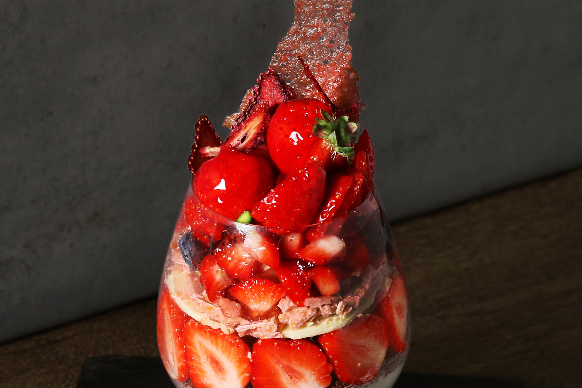 なめらかなマスカルポーネムースとサクサク食感の苺クランチを忍ばせ、ロゼワインのジュレを加えて大人の味わいに仕上げました。