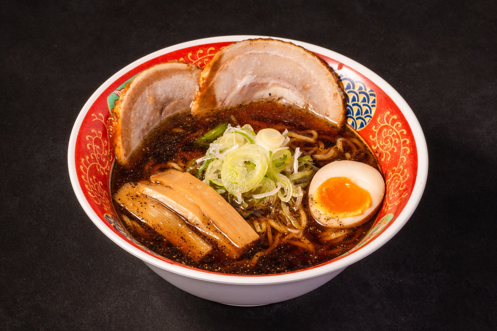 富山県発祥のご当地ラーメン。濃口しょうゆ醬油を煮詰めてたれにした真っ黒なスープが特徴。濃いめのスープにたっぷりかかったこしょうがくせになる、ごはんとあわせてがっつり召し上がっていただけるラーメンです。