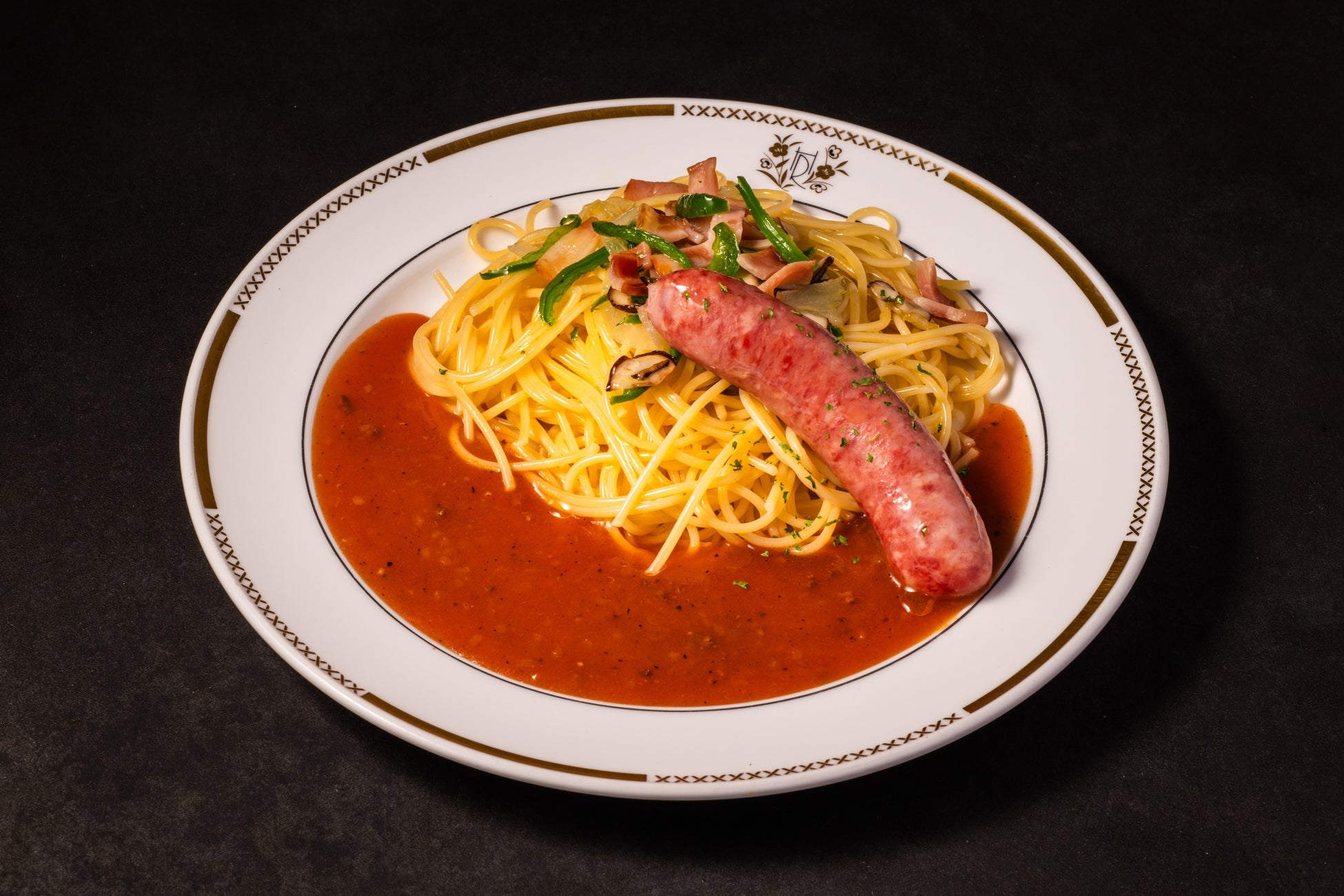 愛知県のご当地グルメ「あんかけスパゲッティ」。野菜のコクと甘さの中に、こしょうを効かせたスパイシーなトマトあんかけソースがパスタ麺とベストマッチ!香ばしいラードを絡めて頂く唯一無二のスパゲッティです。トッピングは山梨県産富士桜ポークを使ったソーセージをまるごと1本のせた、ここでしか味わえない特別メニューと