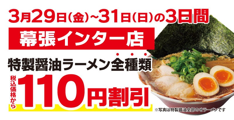この度オープンを記念して、「幕張インター店」にご来店いただいたお客様には、『特製醤油ラーメン全種類』を税込価格から110円割引で販売いたします。