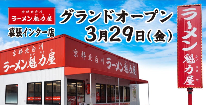 京都北白川ラーメン魁力屋をチェーン展開する株式会社魁力屋(https://corp.kairikiya.co.jp/ 本社:京都市中京区、代表取締役社長:藤田 宗、以下魁力屋)は、2024年3月29日(金)に「京都北白川ラーメン魁力屋 幕張インター店」が千葉県習志野市にグランドオープンいたします。