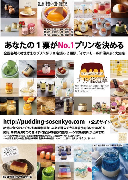 全国各地の個性あふれるプリンの中から”今一番食べてみたいプリンNo.1”を決定する総選挙を実施!全国から38社62種類のプリンが大集結。「新潟」の地に初登場します。