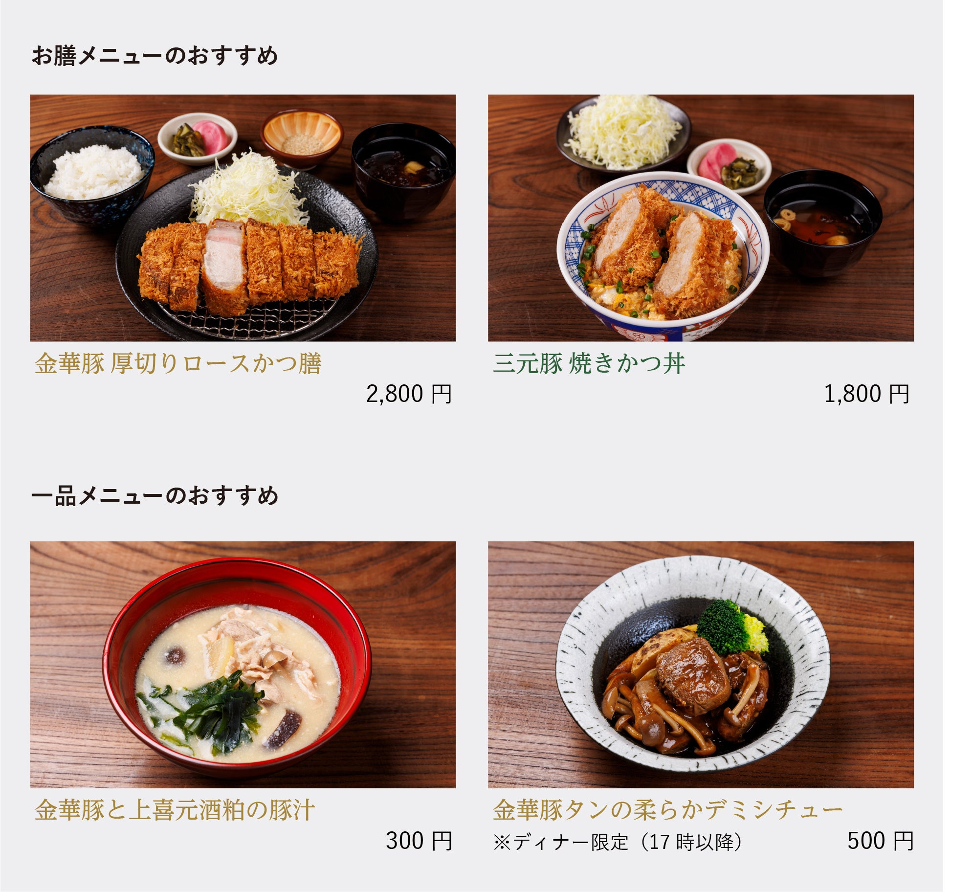 自家用からお土産、贈答用、お弁当まで、幅広いニーズにお応えできるよう展開します。「三元豚ヒレかつ弁当」(1,200円)、 「金華豚豚丼」(1,200円)、 「三元豚かつサンド」(700円)、 「三元豚メンチかつ」など、新幹線でも食べやすいお弁当や食卓の一品に嬉しい惣菜メニューもご用意。いずれも無添加にこだわり、素材のおいしさを最大限引き出したおすすめの逸品です。