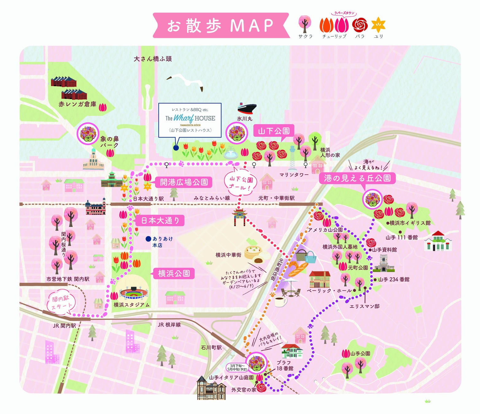 花を見ながら横浜の景色を楽しむことができる「散策コース」をいくつかご用意しています。山下・関内エリア、みなとみらい・馬車道エリア、新横浜エリアなど、市内各所の様々な散策コースを公式ガイドブックでご紹介しています。11分の短距離コースから75分で周る長距離コースまであるので、時間に合わせて様々な方にお楽しみいただけます。