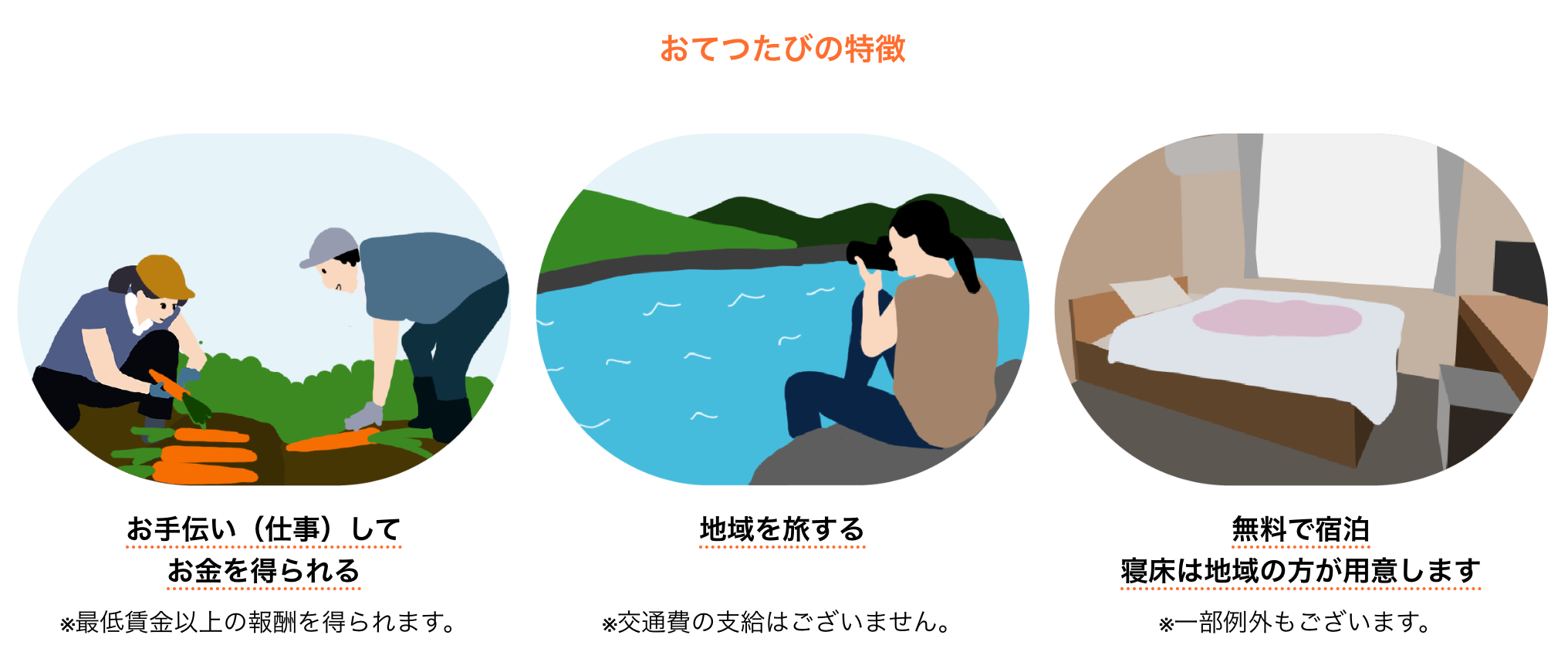 『おてつたび』は、短期アルバイト(お手伝い)とトラベル(旅)を組み合わせた人材マッチングサービスです。短期的・季節的な人手不足に悩む地域現場(旅館・農家など)と、働きながら旅をしたい旅行者をウェブ上でマッチングしています。