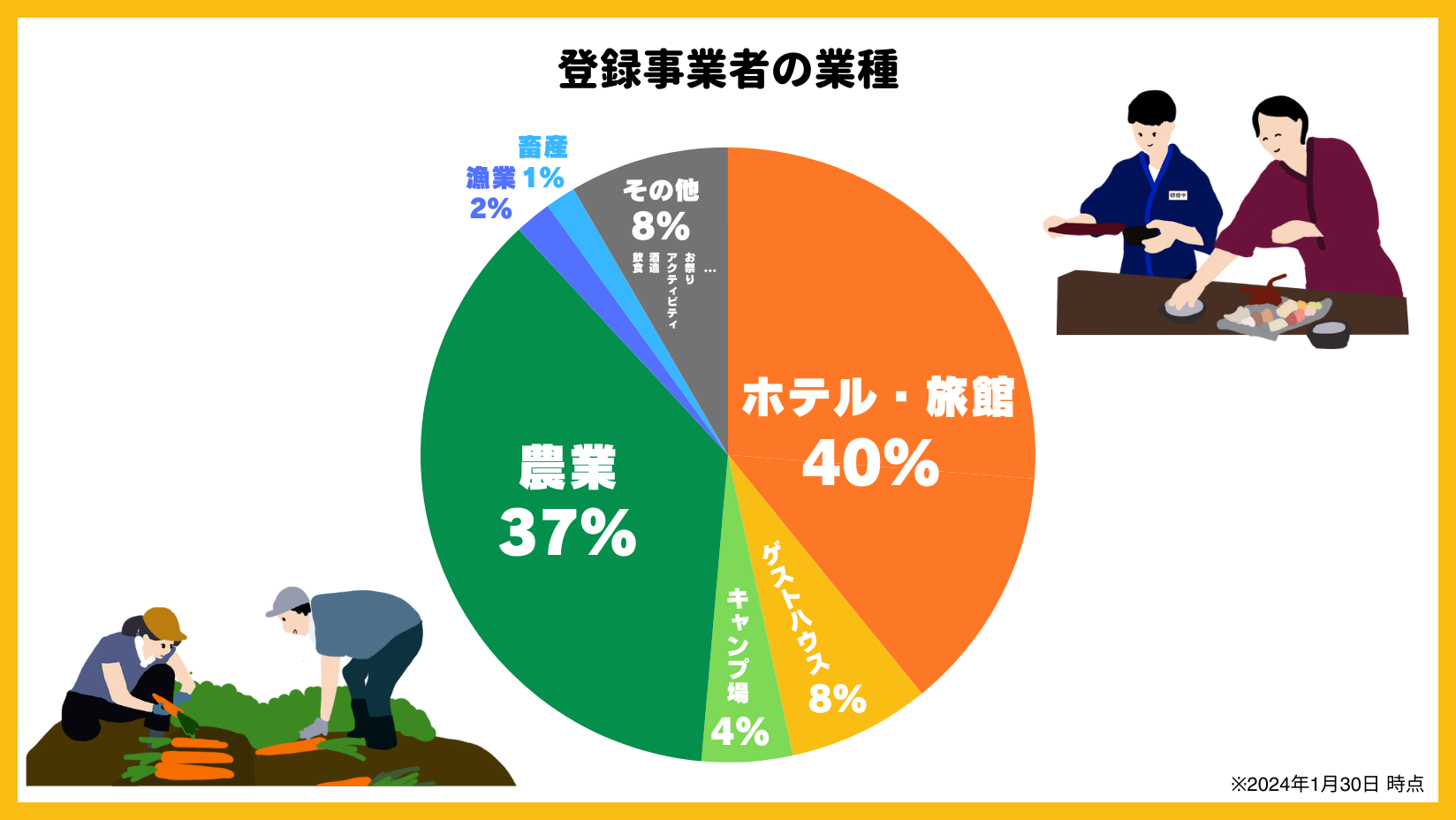 観光需要増加を背景に人手不足が深刻化している「宿泊業」、高齢化による担い手不足が深刻化している「一次産業」の割合が多く、人手不足解消の一助を担っています。