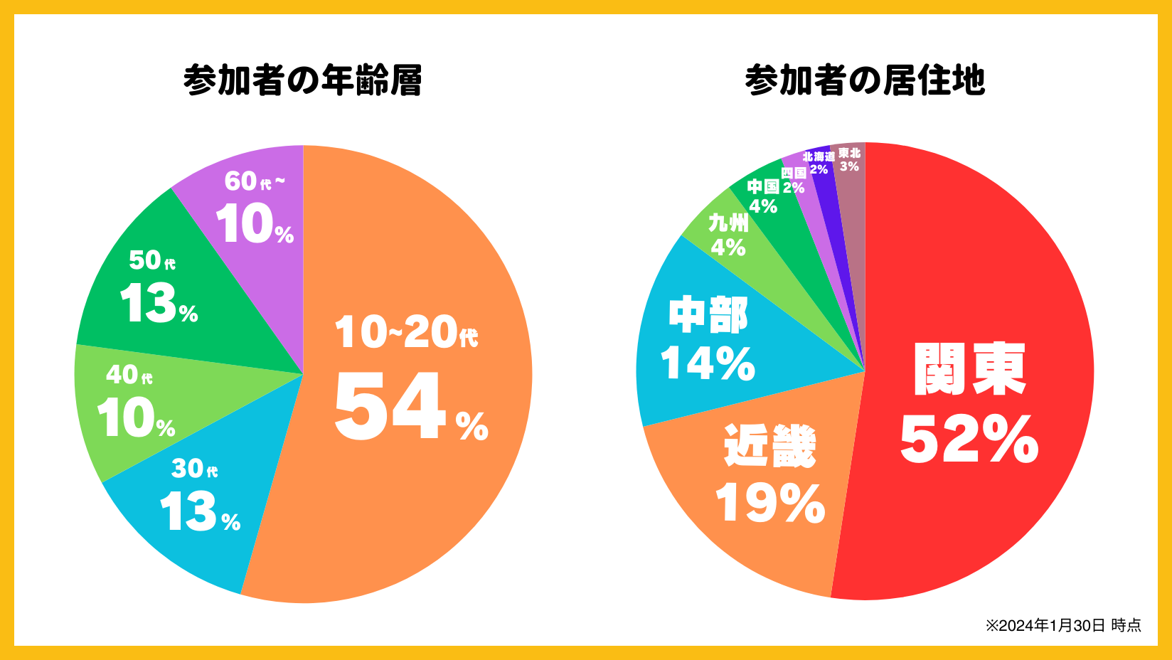 参加者の約半数が10~20代。シニア・主婦層など幅広い年齢層にご利用いただいております。首都圏からの参加が多く、都市部から地方への人の流れを作り出しています。