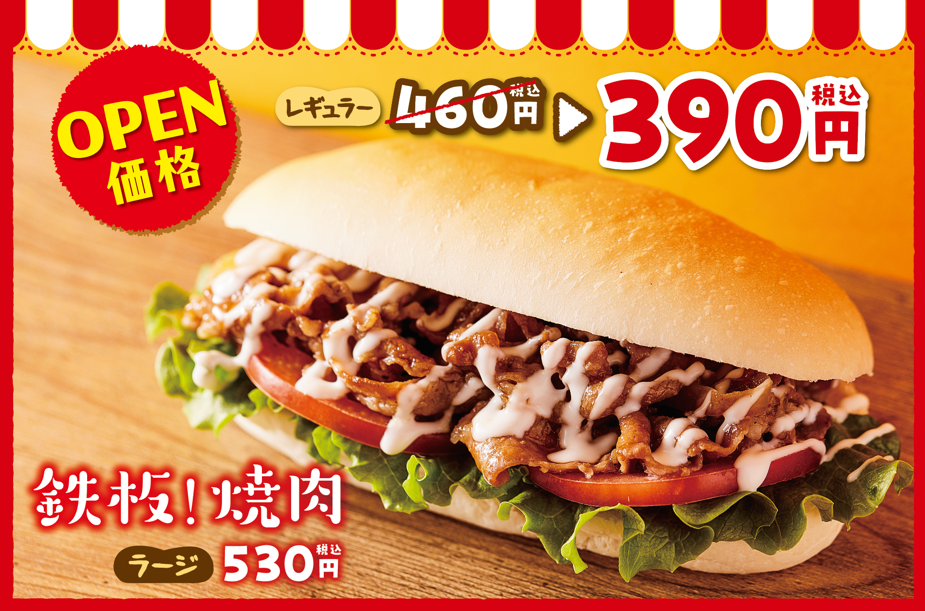 内容:焼きたてコッペ製パンの看板メニュー「鉄板!焼肉コッペ」のレギュラーサイズを、通常価格460円(税込)のところオープン記念セール価格として390円(税込)で販売します。焙煎ニンニクの中辛口たれに漬け置きした牛肉を、店内の鉄板でジューシー熱々に焼き上げています。新鮮な生野菜もサンドしたボリューミーな一品です。この機会にぜひご賞味ください。