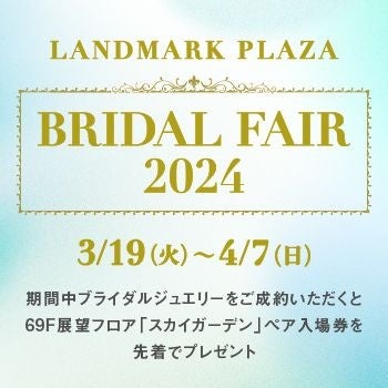 またランドマークプラザでは、3月19日(火)~4月7日(日)の期間、ランドマークプラザ内一部対象店舗で期間中にブライダルジュエリーをご成約すると69階展望フロア「スカイガーデン」のペア入場券がもらえる「BRIDAL FAIR 2024」を開催する他、3月20日(水・祝)~4月7日(日)には、ごみ削減をテーマにしたランドマークプラザSDGsプロジェクト「Reducing waste」も開催し、初めてのコンポスト講座や店舗で実施する古着回収キャンペーンへの参加などをお楽しみいただけます。