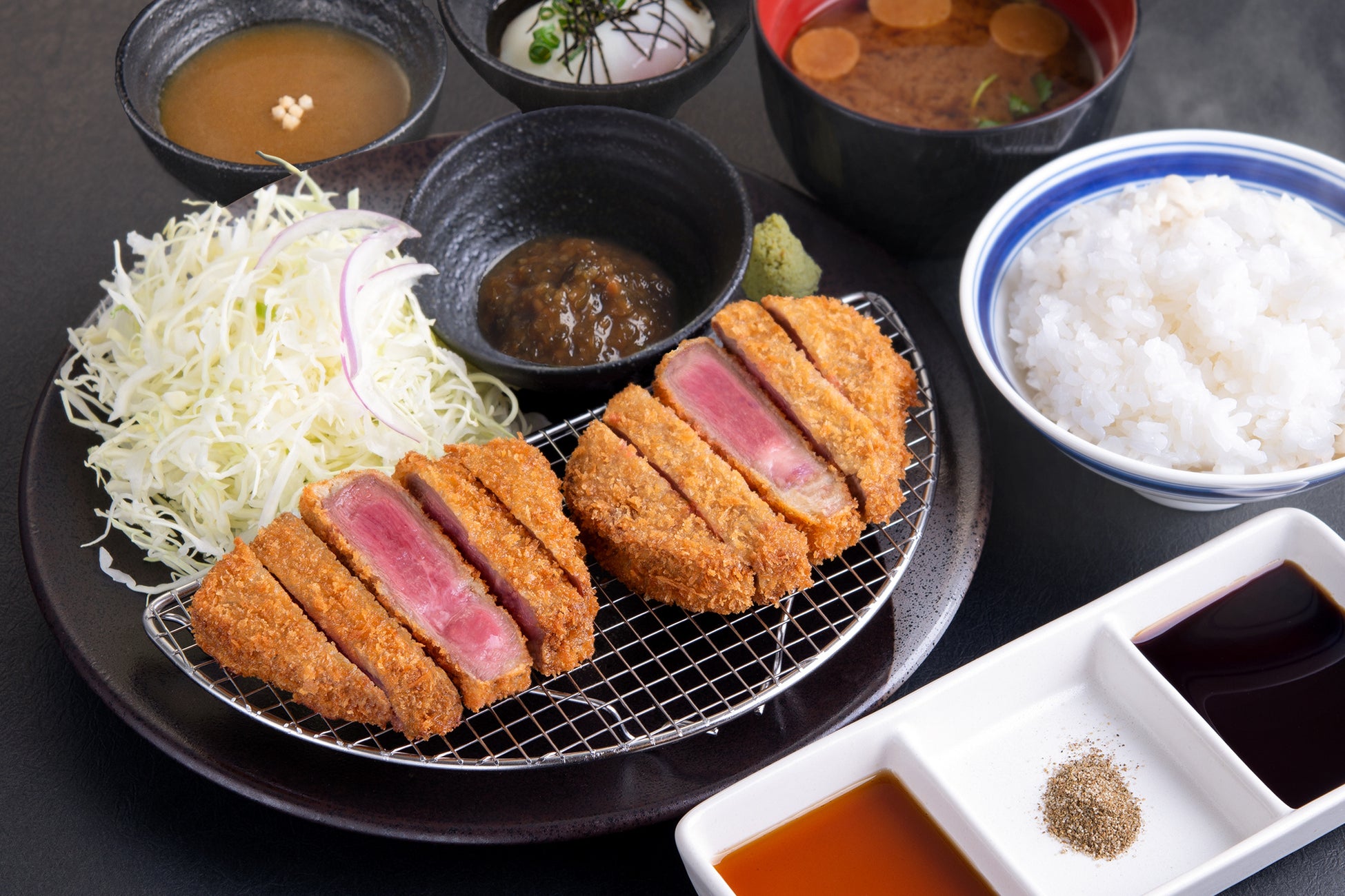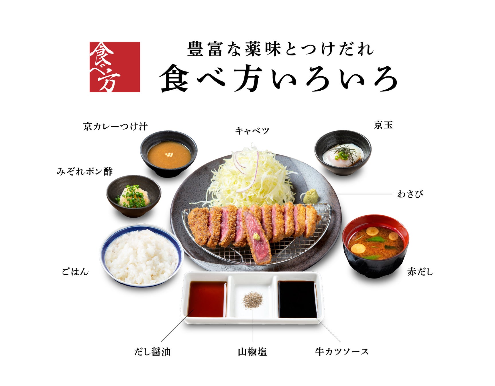豊富な部位に加え、バラエティ豊かな薬味とつけだれをご用意。こだわりの和風だしをたっぷり効かせただし醤油や特製和風カレーつけ汁、野菜の旨味が溶け込んだ牛カツソース、山椒塩など、牛カツとの相性にこだわり抜いたたれ・薬味から、自分好みの組合せを愉しんでお召し上がりいただけます。