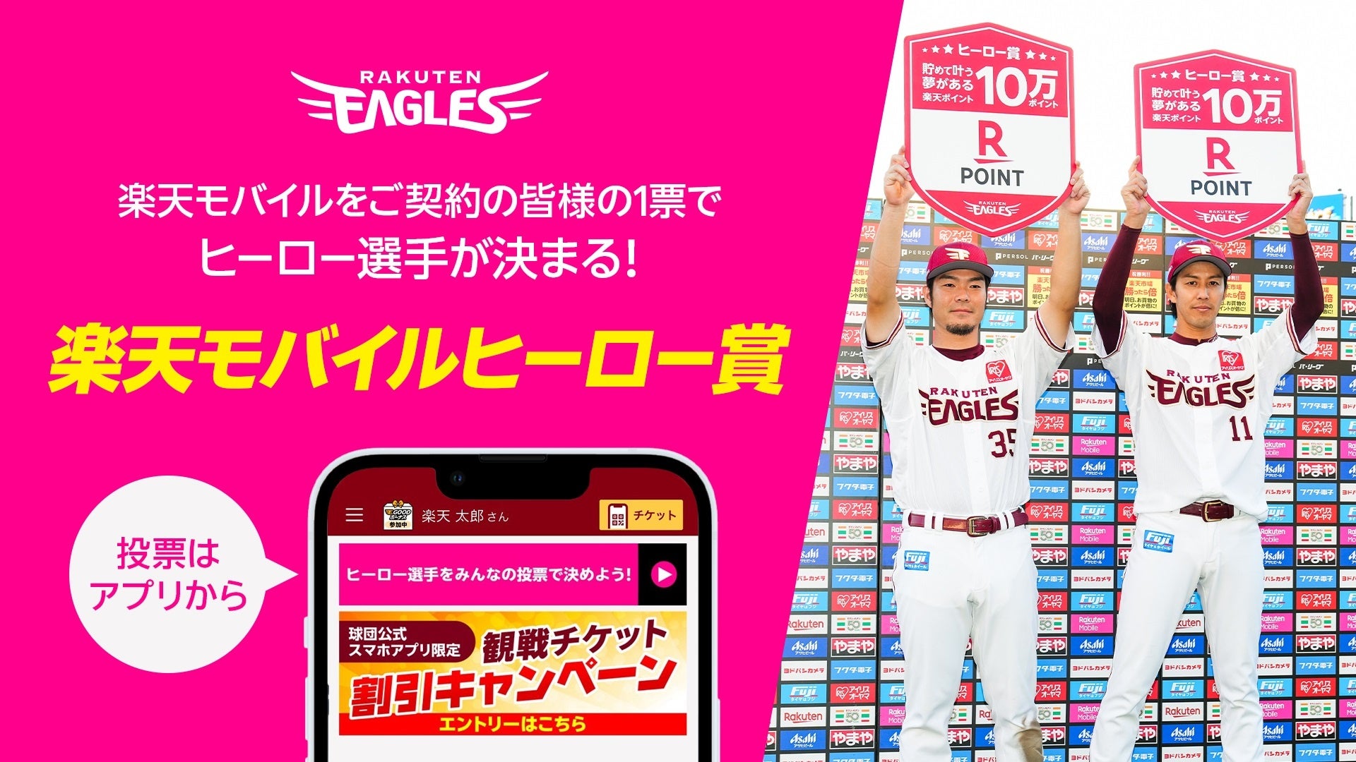 今シーズンは楽天イーグルス勝利時のヒーローインタビューに登場する選手を、楽天モバイルをご契約中の皆さまによる投票で決定いたします!