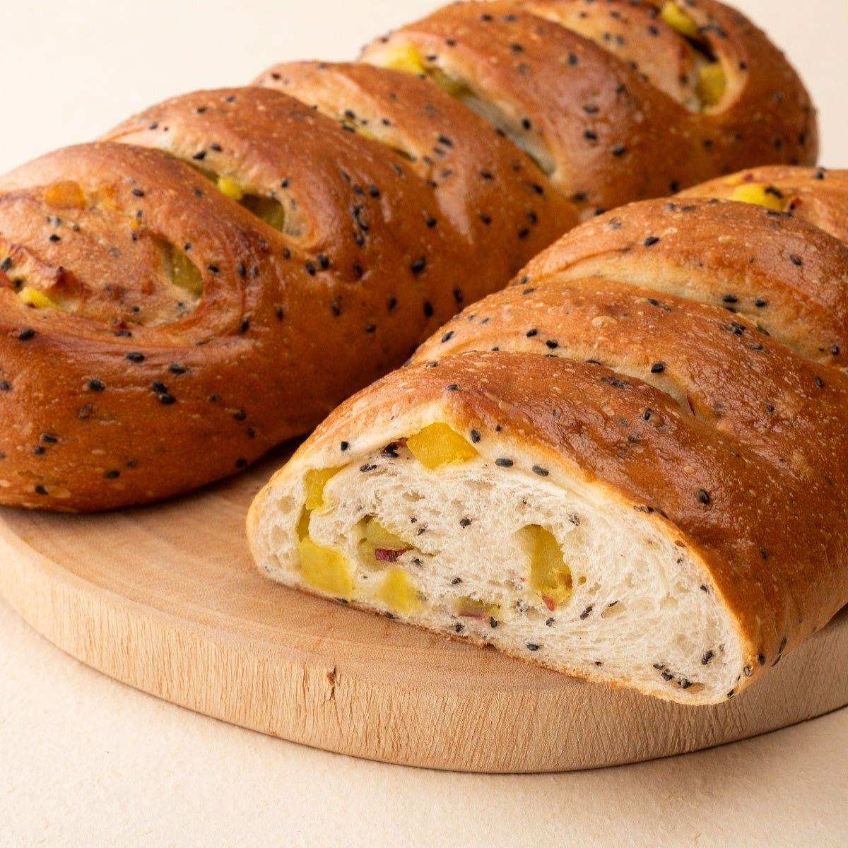 ほんのりシナモンとオレンジが香るチョコレートスプレッドを巻き込みしっとり焼き上げました。チョコレートチップがさらに濃厚な味わいを引き立て、スイーツとしてもお楽しみいただける味わいです。