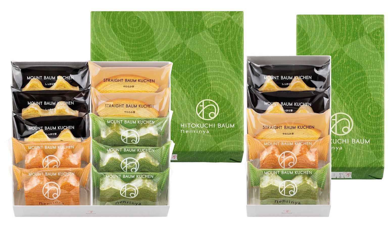 ねんりん家、初夏の詰合せ。濃厚なバター香る代表作「マウントバーム しっかり芽」。芳醇宇治抹茶⾹る「マウントバーム お抹茶」。ふっくらジューシーな「ストレートバーム やわらか芽」。