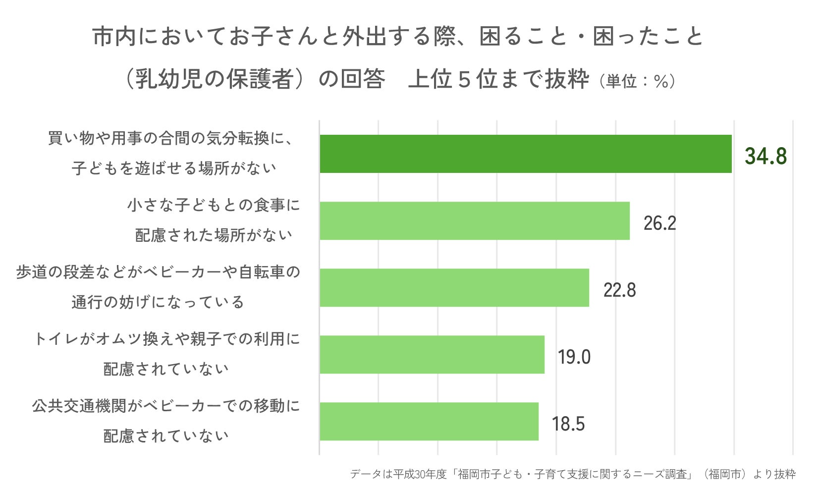 福岡市では2020年時点で15歳未満の子どもが約20万人、夫婦と子ども・ひとり親と子どもの世帯を合わせた子育て世帯が約28%を占めています。平成30年度に福岡市により行われた「福岡市子ども・子育て支援に関するニーズ調査」では、「市内においてお子さんと外出する際、困ること・困ったこと(乳幼児の保護者)」という項目に対して挙げられた回答の第1位が「買い物や用事の合間の気分転換に、子どもを遊ばせる場所がない」(34.8%)でした。市内において、特に5歳までの乳幼児を抱える保護者のこのような遊び場のニーズが高いことが伺えます。