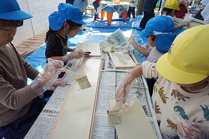 「スキッズガーデン キャナルシティ博多店」では、内装の一部を地域のお子さまたちにお手伝いいただき、壁面などの装飾を一緒に作り上げていただきました。装飾のペイントや素材には、環境に配慮した素材やリサイクル素材を資料。地域のみなさまとともに、エシカルなお店づくりを行っています。