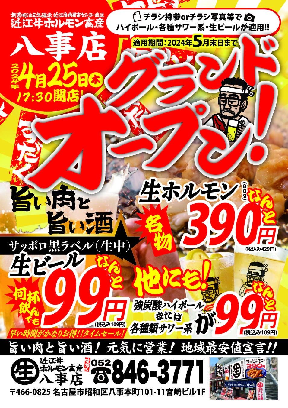 2024年4月25日(木)の近江牛ホルモン畜産すだく八事店のグランドオープンを記念して、「生ビールと強炭酸ハイボール、各種サワー系がなんと!!!99円!?」キャンペーンを開催いたします。