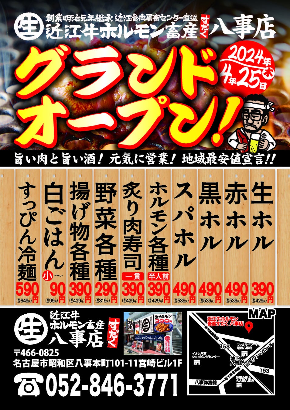 株式会社総合近江牛商社(本社:滋賀県守山市/代表取締役社長:西野 立寛)が運営する『焼肉ホルモンすだく』は、2024年4月25日(木)にフランチャイズ店として『近江牛ホルモン畜産すだく八事店』(愛知県名古屋市)をグランドオープンいたします。オープンを記念し、生ビール99円~などのオープニングイベントを実施いたします。