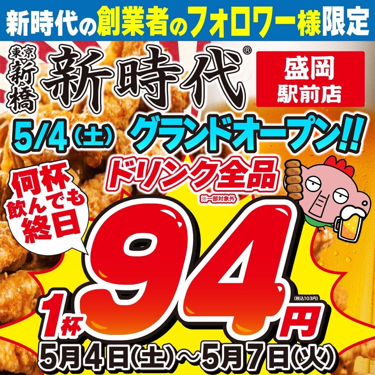 【新規オープン】岩手県に2店舗目出店!【5月4日(土)~5月7日(火)は、更にお得!】新時代の創業者のInstagramをフォローするだけで、何時でも、何杯飲んでも、ドリンク全品1杯94円のお得なセールを開催します!