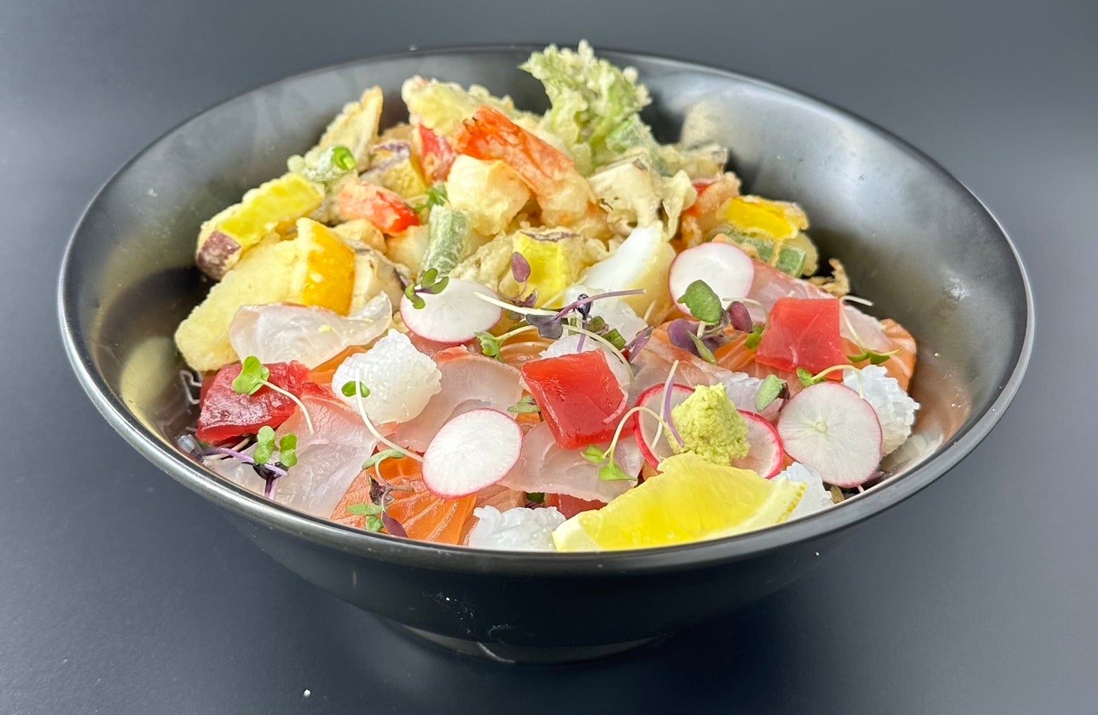 天丼と海鮮丼を融合させた、夢のようなどんぶり「天刺」をご提供いたします。サクサクの天麩良が香ばしさをプラスし、新鮮な海の幸が潤いを加えます。この一杯で日本の天麩良と海鮮の幸せな共演をお楽しみいただけます。