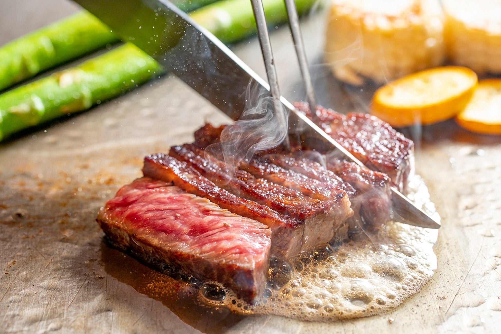 厳選された国産牛やあわびなどの高級食材を贅沢に鉄板焼で!選りすぐりの国産牛、きめ細やかなサシの入ったサーロインはとろける舌触り。最高の食材、ソムリエが厳選したワイン、空間とサービスで、お客様をおもてなしいたします。