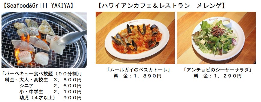 島内のレストラン「Seafood&Grill YAKIYA」「ハワイアンカフェ&レストラン メレンゲ」では、サカナや海の幸を使った料理をご提供いたします。フータが解説しているサカナの味がどんな味か、実際に食べて味わっていただけます。