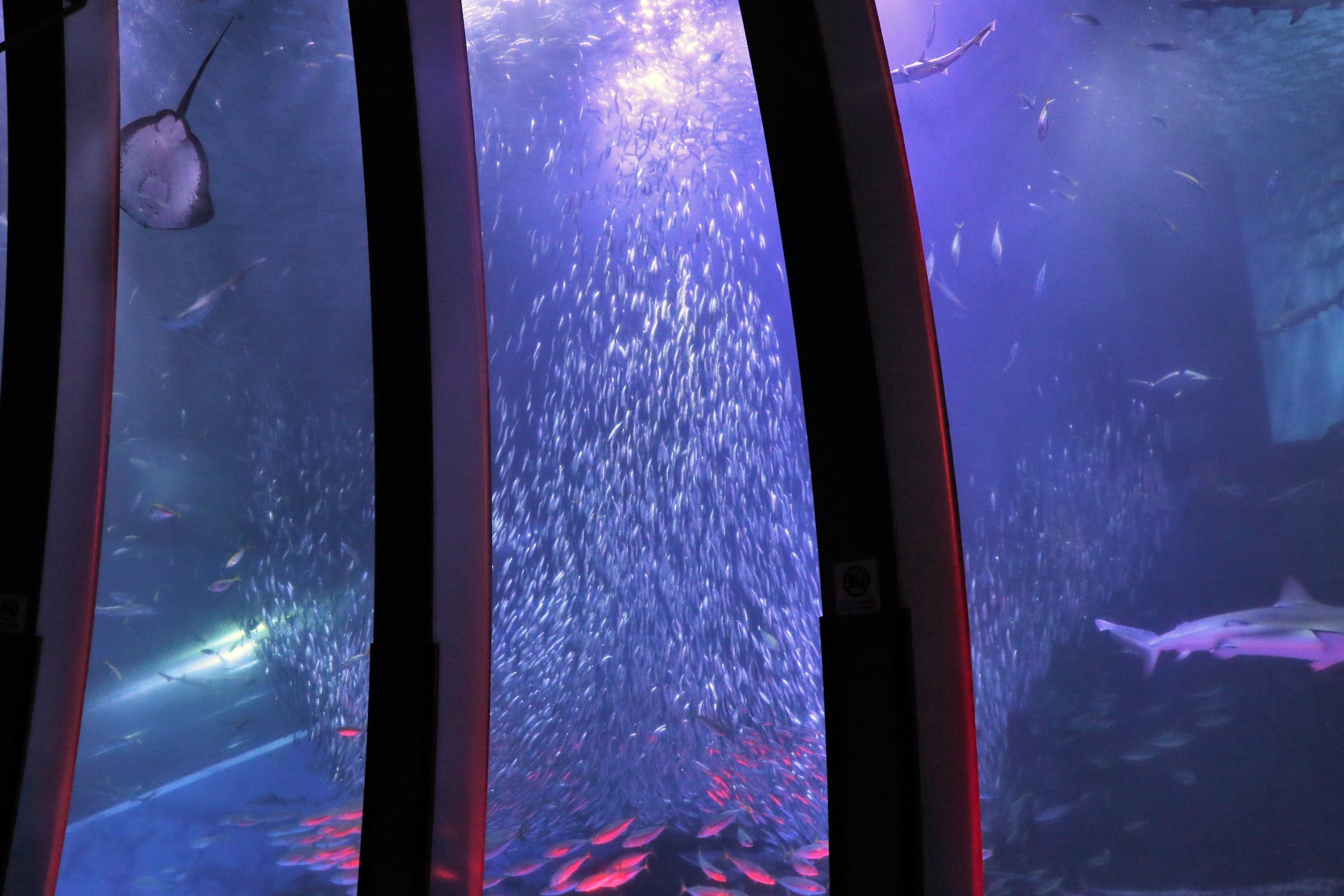 水族館「アクアミュージアム」にある高さ8m、水量1,500トンの大水槽「大海原に生きる群れと輝きの魚たち」では、国内最多飼育数5万尾のイワシが音楽や照明に合わせ 乱舞する「スーパーイワシイリュージョン」を毎日開催しています。