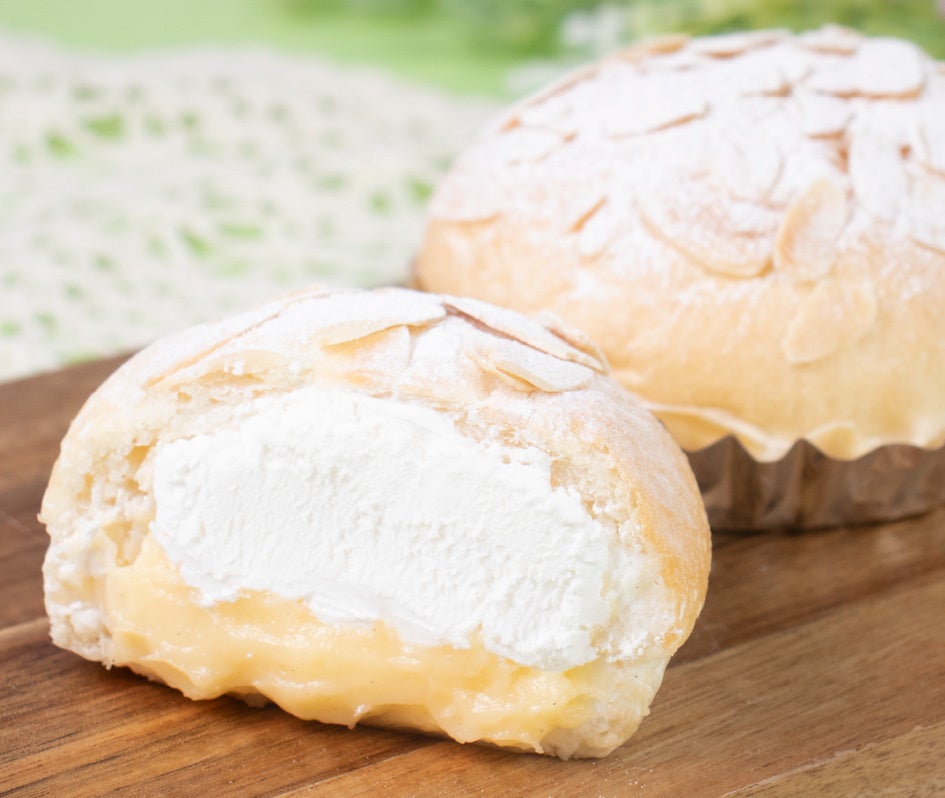 商品特徴:なめらかなカスタードクリームと、くちどけの良いホイップクリームをふんわり包んだ贅沢クリームパン。パリパリのアーモンドスライスをまとって、さらにプレミアムに!