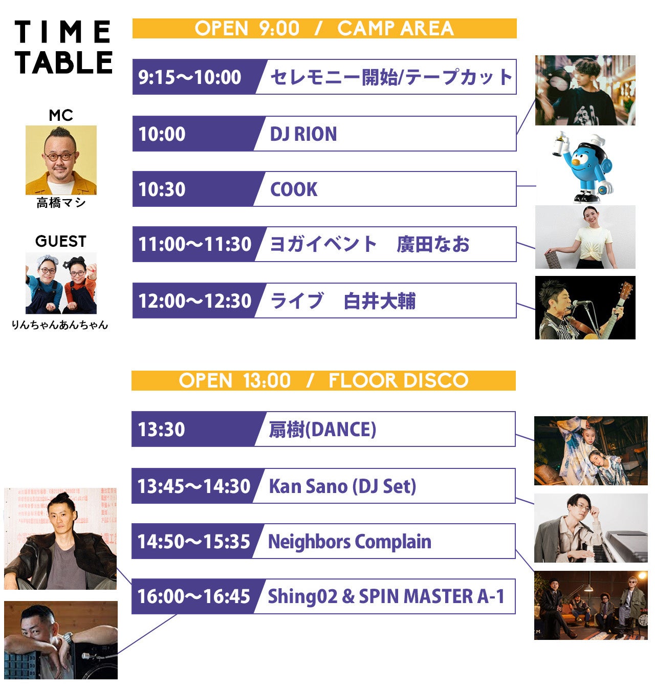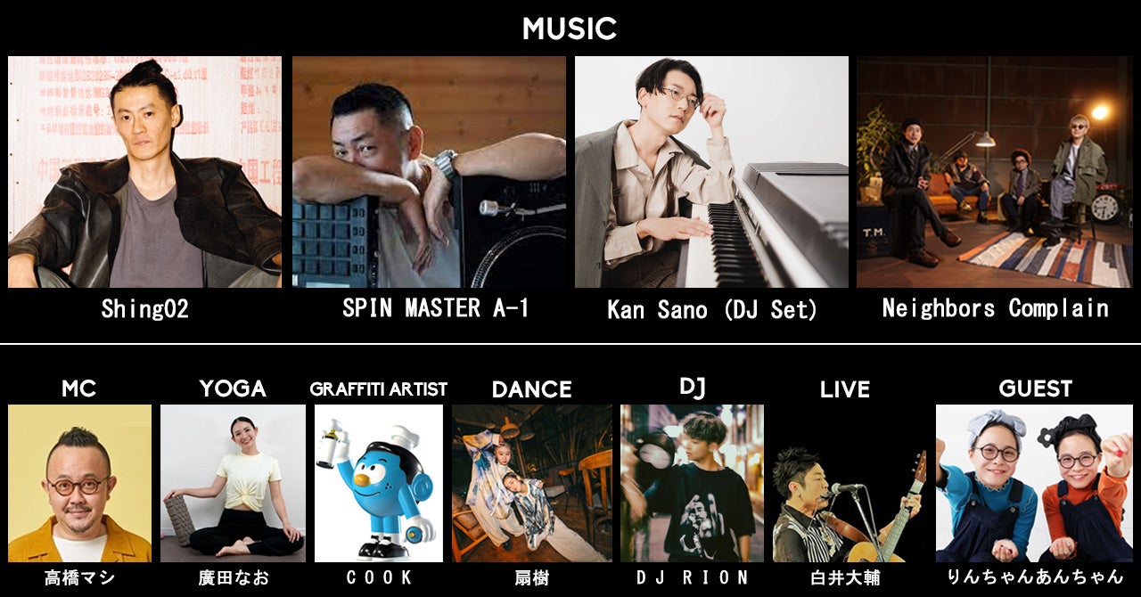 <出演アーティスト一覧>【Shing02】【SPIN MASTER A-1】【Kan Sano(DJ Set)】【Neighbors Complain】【廣田なお】【高橋マシ】【COOK】【扇樹】【りんちゃんあんちゃん】【DJ Rion】【白井大輔】(※順不同)