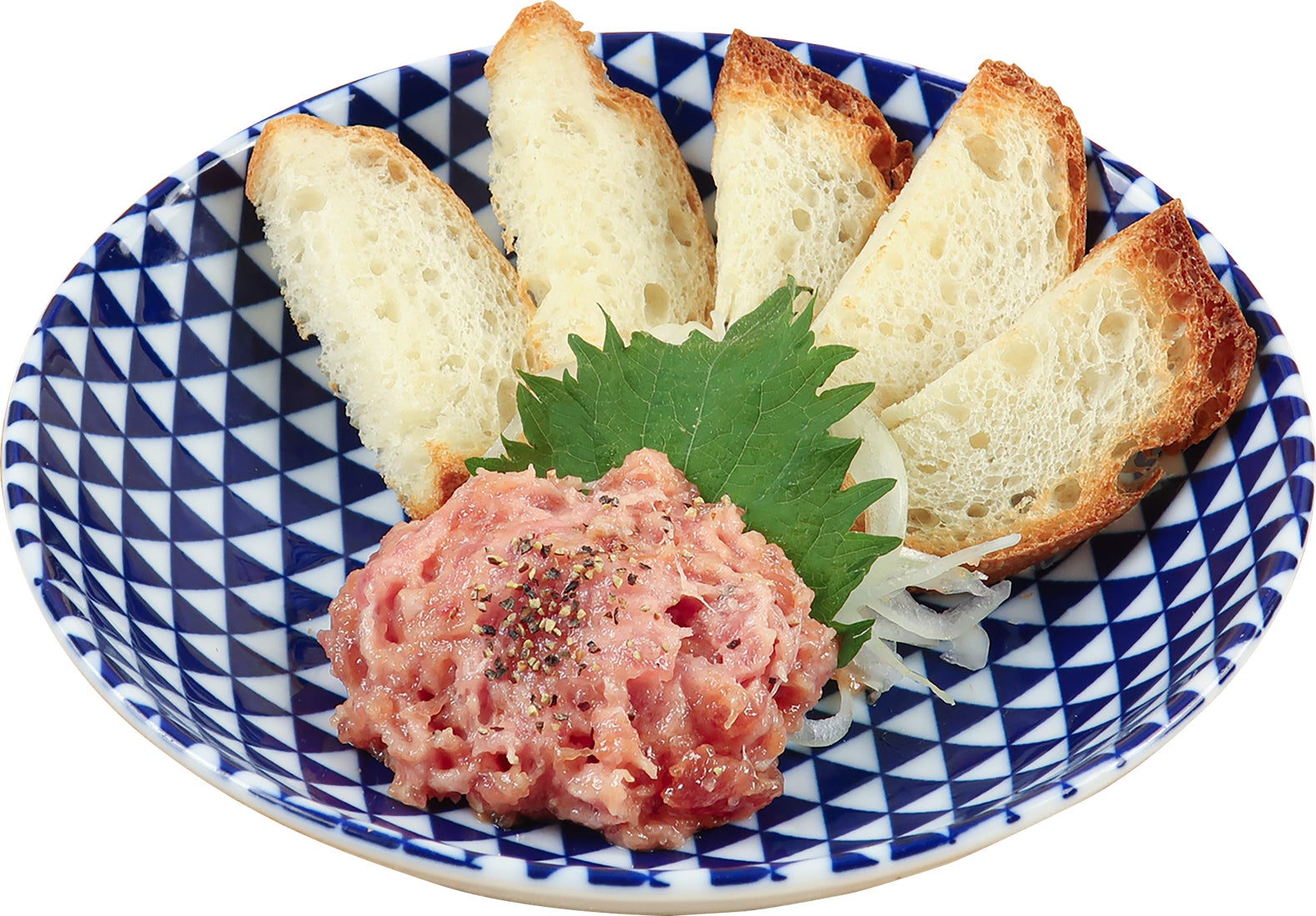 あえてまぐろの粒感を感じられるように仕立てたねぎまぐろに、オリーブオイルを合わせ、よりねっとりした味わいに。温かいバケットに合わせてお楽しみください。