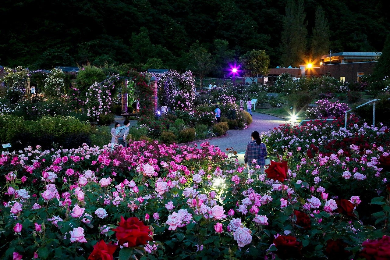 ●ライトアップされたバラ園、昼間とは違う景色をお楽しみいただけます。