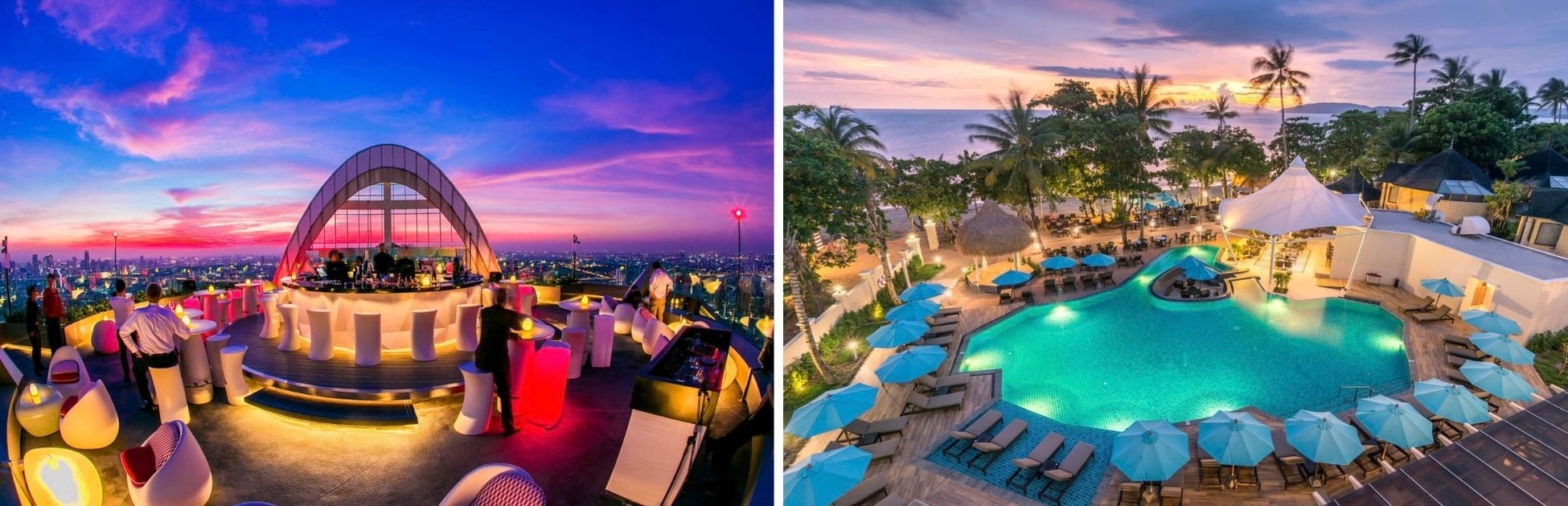 センタラ スカイビアガーデン」では、日頃の疲れも吹き飛ぶ絶景空間で、シェフこだわりの本格的な料理の数々をお楽しみいただけます。中でも、3段スタンドにフィンガーフードを盛り合わせ”ハイティー”スタイルでご提供する前菜は必見です。その他にも、本格的なグリルビーフや季節の魚料理などをセットメニューやアラカルトでご用意しております。ドリンクはタイのビール「シンハー」や「チャーン」を含むビール5種類、ヘッドバーテンダーおすすめのカクテルやワイン、ハイボール、ソフトドリンクなどをフリーフロー(飲み放題)でお楽しみいただけます。