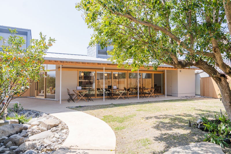 店舗敷地内には、和歌山にゆかりのある木々や植物、柑橘の木が植栽された庭が広がり、みかん畑に囲まれた開放的な空間でゆったり流れる時間を楽しんでいただけます。