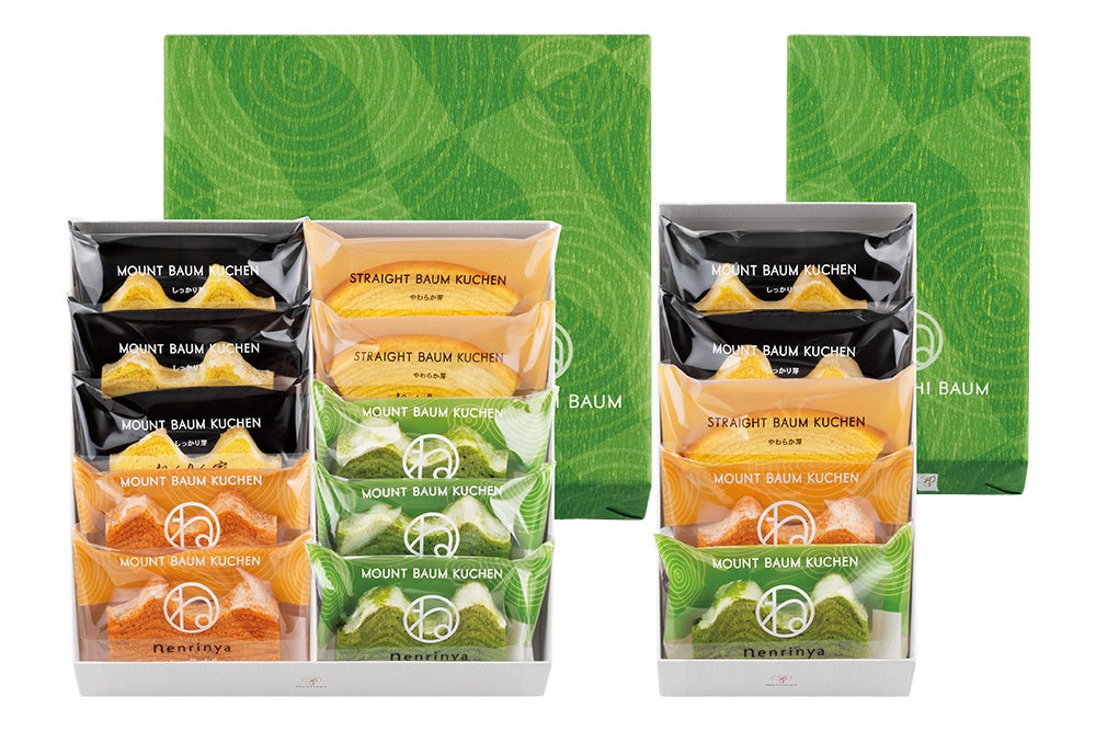 初夏限定ひとくちサイズのお詰合せ。代表作「マウントバーム しっかり芽」に、芳醇宇治抹茶⾹る「マウントバーム お抹茶」、こっくり香ばしいキャラメル「ひとくちマウントバーム 塩キャラメル」、たまごたっぷりにふっくら焼きあげた「ストレートバーム やわらか芽」。