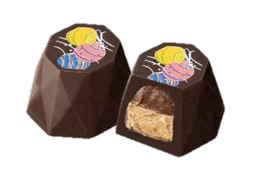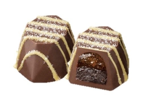 ダークチョコレートガナッシュにピーチ風味のコンフィチュールを重ね、まろやかなミルクチョコレートで包みました。イエローのラインに白のグリッターが夏まつりの水飴をイメージしています。
