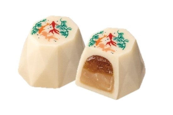 甘美なブラッドオレンジガナッシュと酸味のあるレモン風味のコンフィチュールを重ね、ホワイトチョコレートで包みました。トップには優美な金魚のイラストをあしらいました。