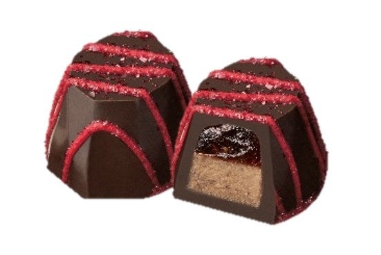 ストロベリー風味のコンフィチュールとスイカのプラリネをダークチョコレートで包みました。夏まつりのリンゴ飴のような赤いラインとグリッターで飾りました。