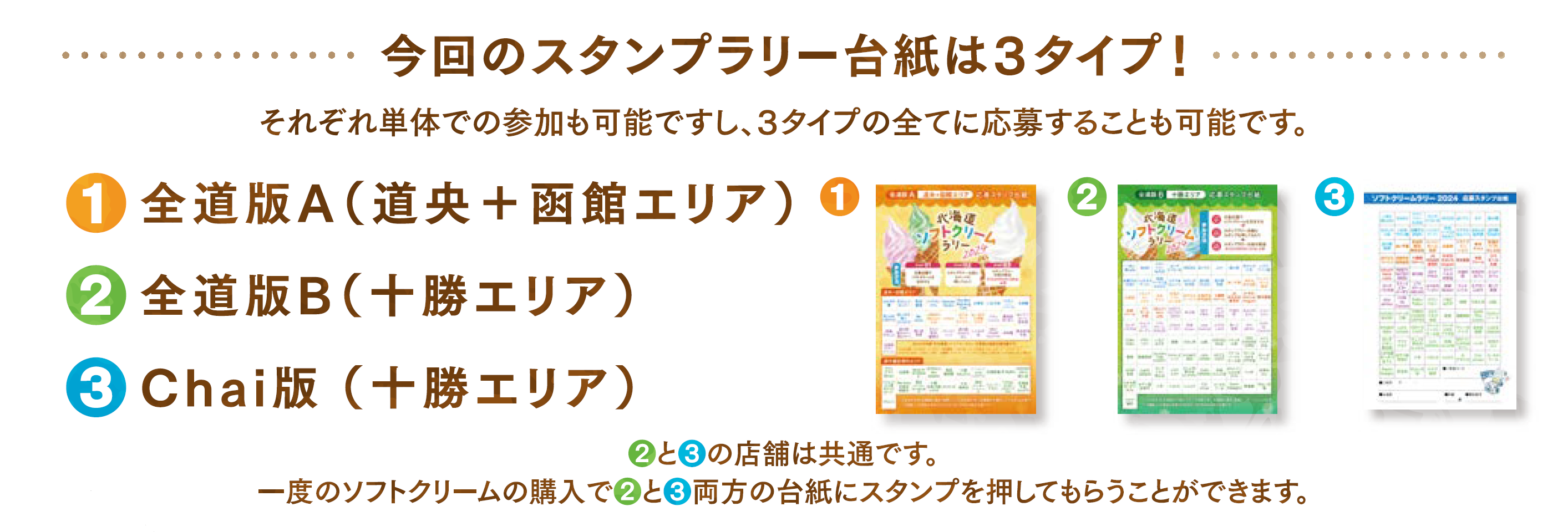 「Chai」主催の十勝版も、例年通り開催されることに加え、エリア拡大に伴い、今年度は3種類のスタンプラリー台紙をご用意します。それぞれ単体での参加も、すべての台紙で参加することも可能です。