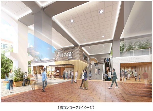 また、環境面では、照明演出やナチュラルテイストの素材使用による明るくにぎわい感のある空間を創出しています。加えて、2階の駅改札コンコースから商業エントランスまでを一体的な空間とし、館内の2ヵ所に緑が印象的なレストスペースを設ける等、心地よい空間への導入も演出しました。