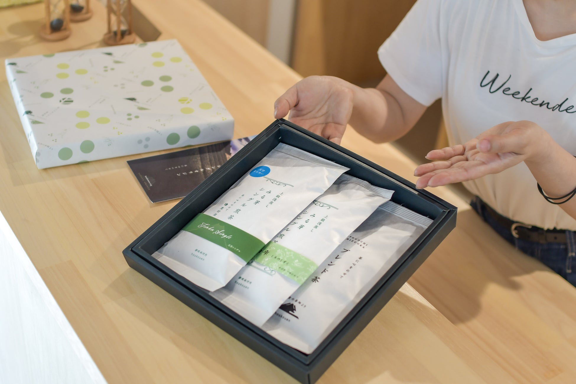 その日にご用意する茶種の試飲や、品種茶飲み比べセットで気に入ったお茶をご自宅用に選ぶも良し、ご用意する「チャ郵便封筒」に切手を貼り観光地ポストカードのように郵送お届けするも良し、茶農家と相談しながら2~3種の茶を選びギフト包装、全国への贈答発送も承ります。