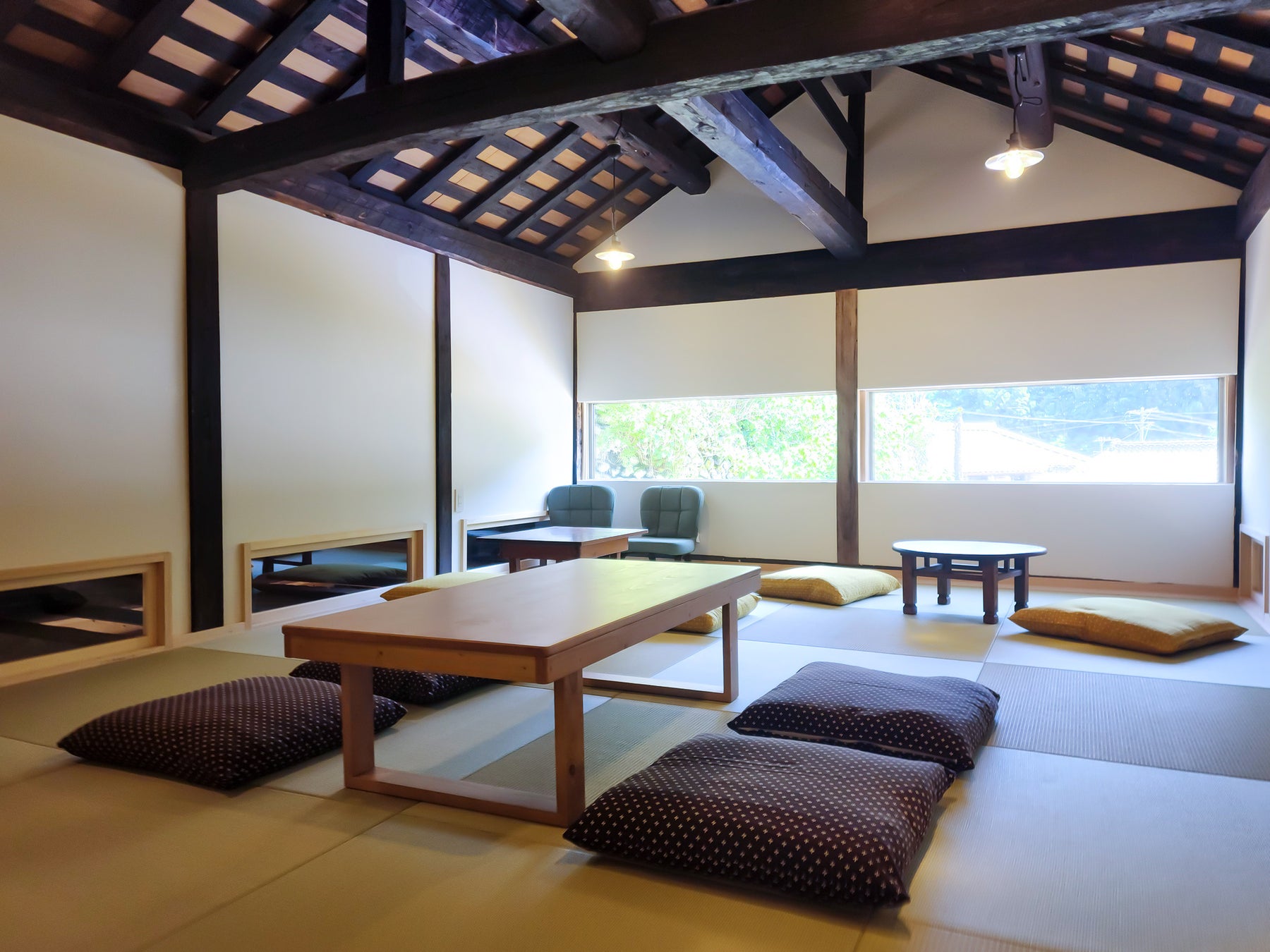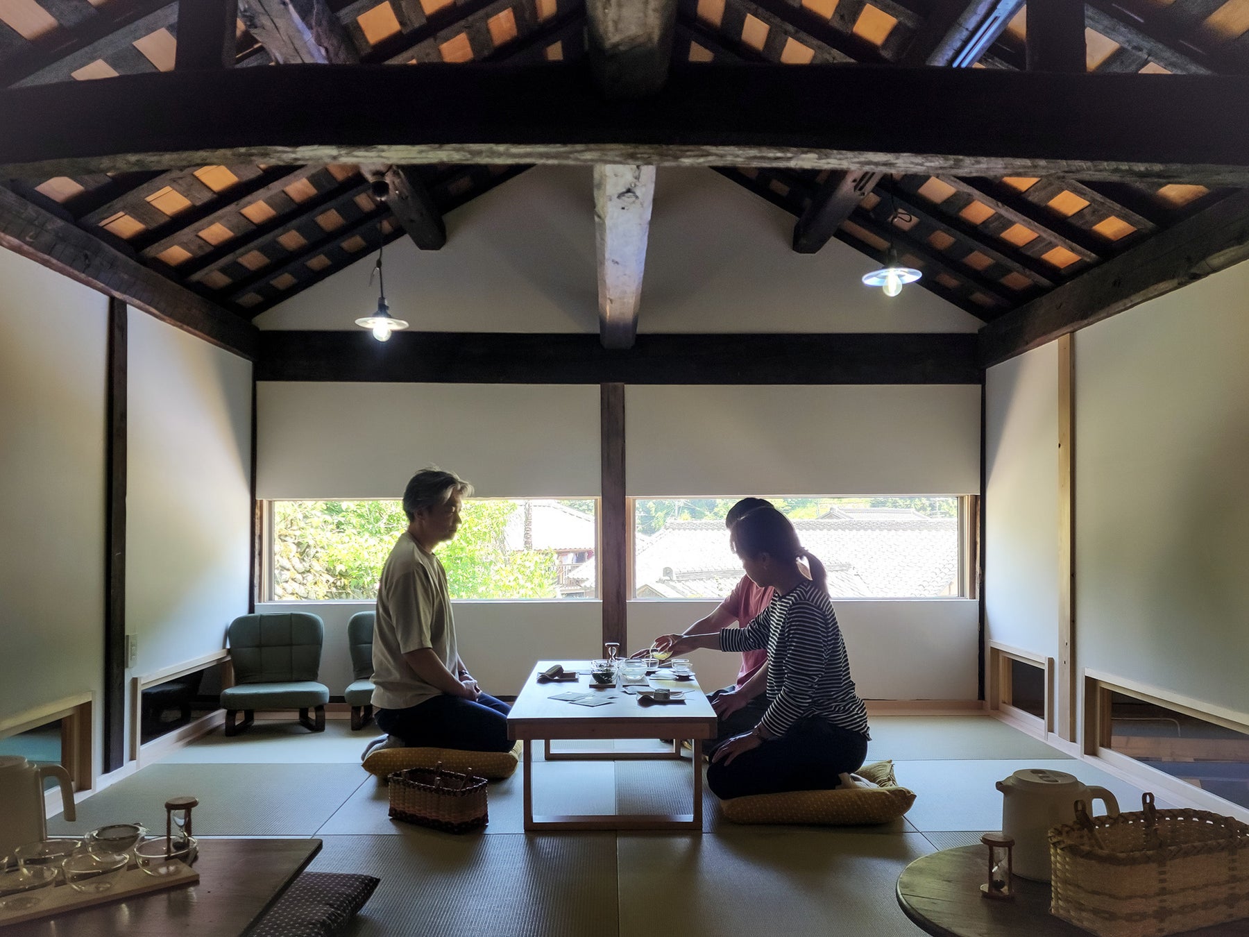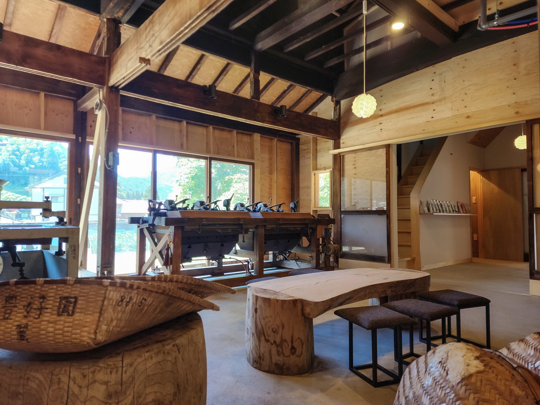 その昔、蚕(カイコ)部屋であったであろう2Fを「畳の間」に改装し、梁・天井はそのまま活かしたお茶飲みオープンスペースとして開放。東面に採光窓、壁面の地窓からは1Fの製茶場を少しだけ垣間見ることができます。靴を脱いでゆっくりお茶を楽しみたい際には、こちらをご利用ください。