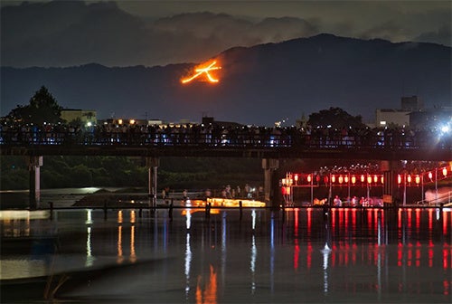 京都各地にある5つの山それぞれが午後8時から順に「大文字」「妙法」「船形」「左大文字」「鳥居形」の形に点火されます。