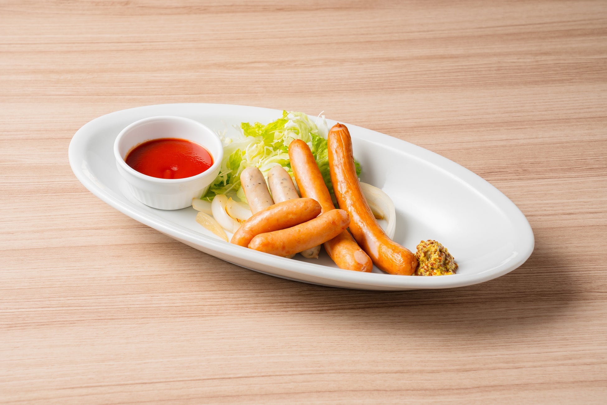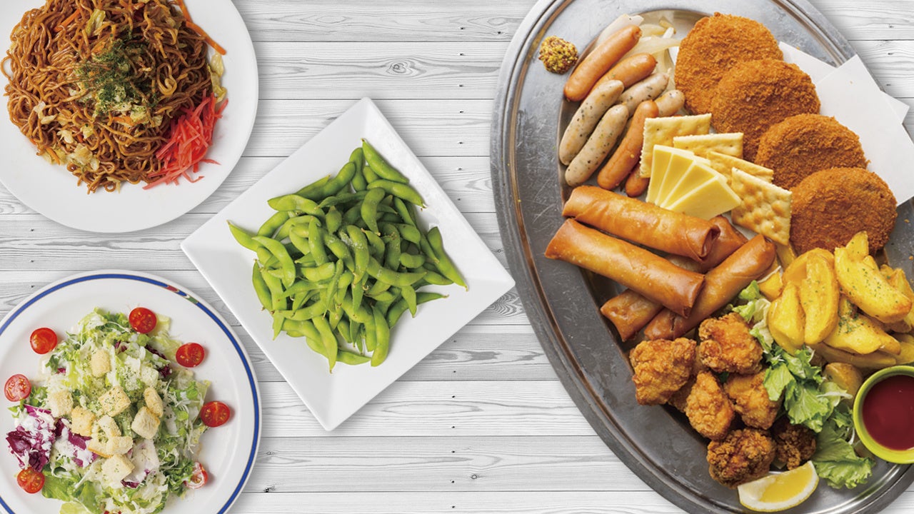 枝豆・シーザーサラダ・メンチカツ・唐揚げ・チーズ&クラッカー・ポテトフライ・ソーセージ盛り合わせ・春巻き・焼きそば