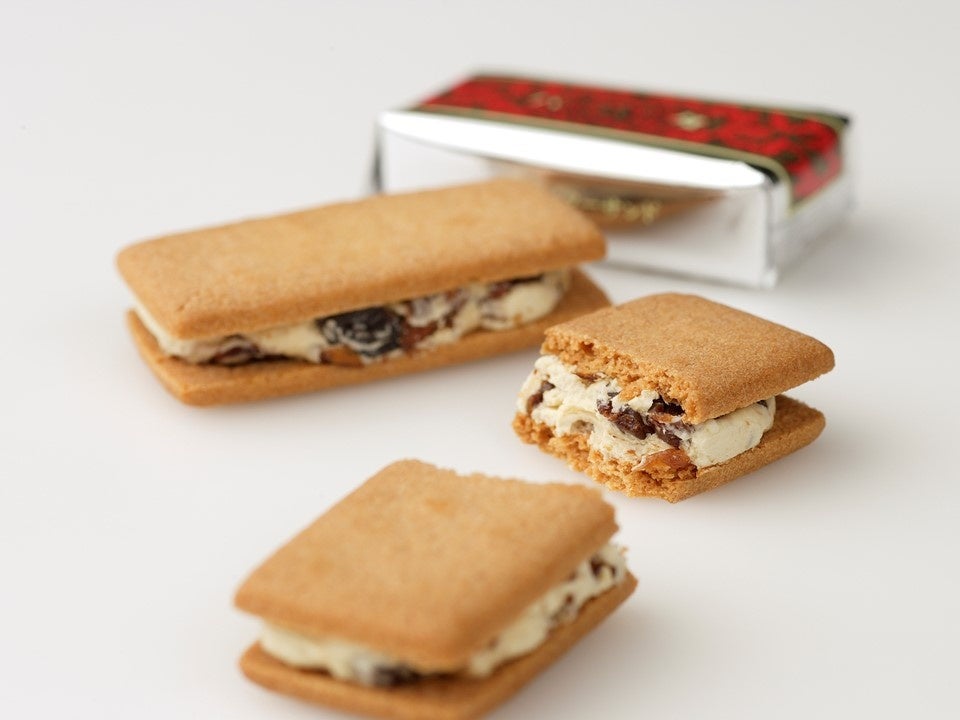 六花亭専用の小麦粉でつくったビスケットで、ホワイトチョコレートとレーズン、北海道産生乳100%のバターをあわせたクリームをサンドした、ロングセラー商品です。