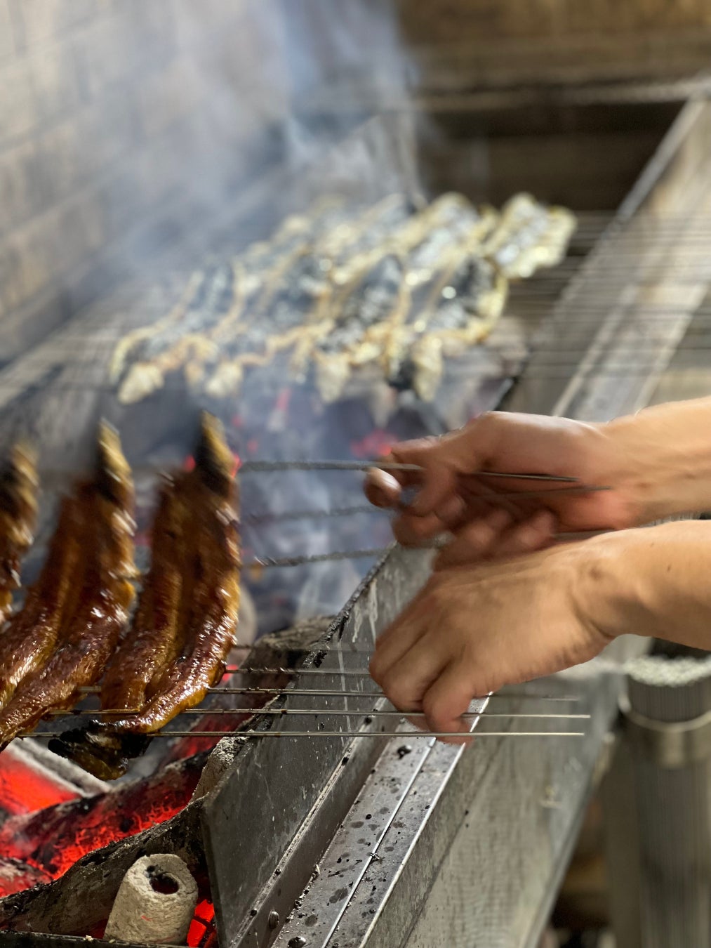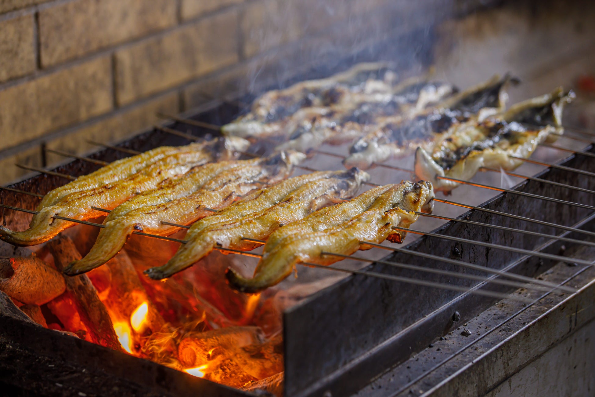 生から高温の炭火で一気に焼きあげていく関西風炭火地焼きです。1000℃を超える備長炭の火力で一気に焼き上げていくため、皮は”パリッ”、身は”サクッ”とした歯切れの良い食感と、ジューシーな脂の旨みが特徴。焼き始めてから串を足していく”縫い串”をしながら均等に火が入るように焼いていきます。関東風のように蒸す工程はなく、生から一気に焼き上げる関西風の地焼きは、うなぎ本来の味を愉しんで頂けます。