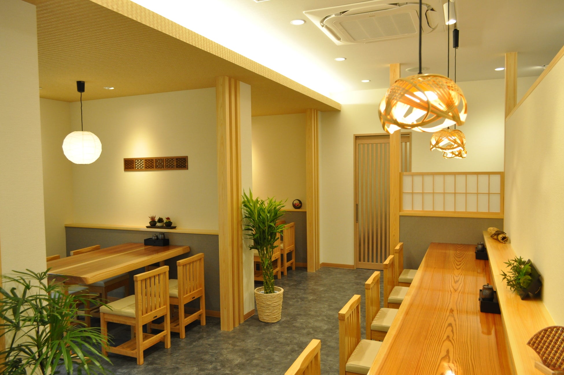 姫路方面から国道372号線を東へ、市川を越えてすぐ左手にオープンします。店内は白木のテーブルがゆったりと配置された和の空間。全席が椅子のお席でカウンター、テーブル、個室をご用意しております。全席が椅子のお席なので靴を脱ぐ必要もなく、バリアフリー仕様にしているため車イスやベビーカーのままでもお席について頂けます。どちらのお席も広々とした空間で落ち着いて食事が楽しめます。