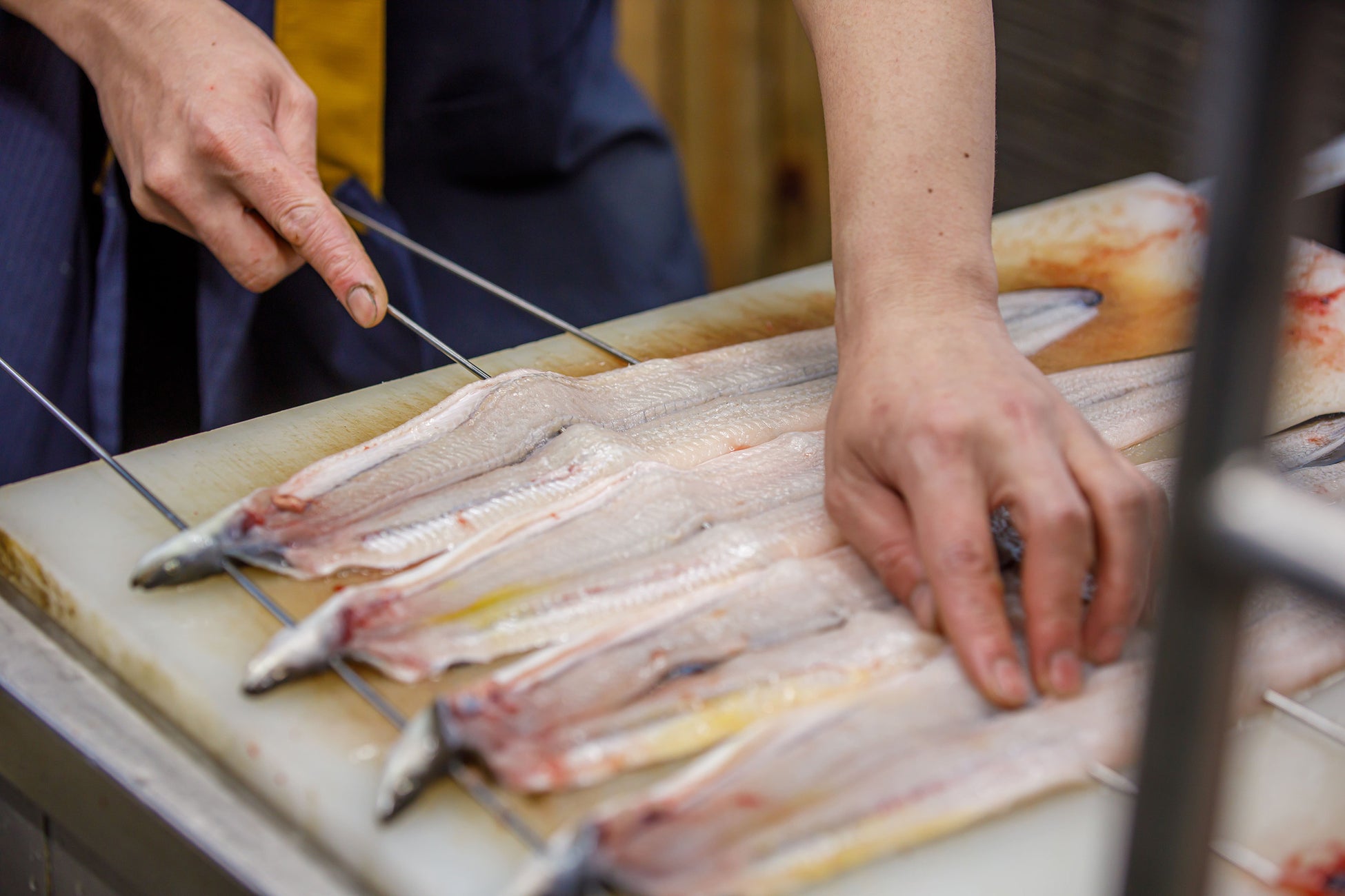 萬鰻亭にはうなぎを捌く専門の職人”鰻師”がいます。厳選された活きたままのうなぎを、当日の朝、鰻師が捌いていきます。関西包丁で素早く腹開きにし、丁寧に串を打っていきます。うなぎの調理と言えば厳しい修行のイメージが強いですが、それも昔の話。萬鰻亭ではわかわりやすい技術指導と実際の捌きを徹底して経験してもらうことで、未経験でも半年以内に捌けるようになっています。