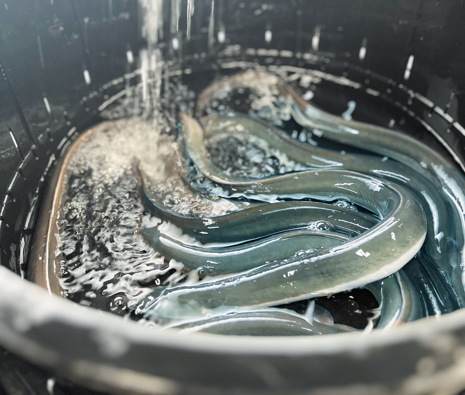 『活鰻』と呼ばれる活きたままのニホンウナギを仕入れています。調理する直前まで店内にある泥抜きをする部屋”立て場”で保管。写真にある専用の桶にうなぎを入れ、1~2日程度清涼な水にさらすことで体内に残っているうなぎの泥臭さなどを体外に排出させます。鮮度抜群の安心安全なおいしいうなぎにこだわっています。