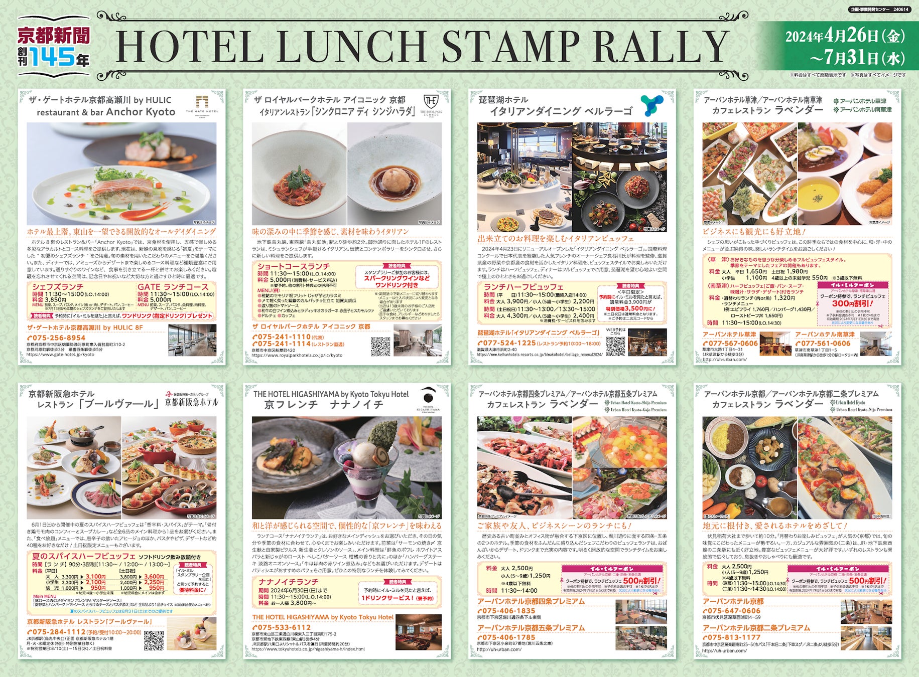 京都新聞グループの京都新聞企画事業は、京都新聞創刊145年記念として京都新聞のサブ媒体であるIru・miru(イルミル)で、京都・滋賀の11ホテルにご参加いただいた、「ホテルランチ・スタンプラリー」を現在展開中です。